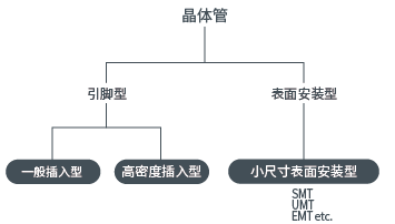 根据功率及安装形态,决定了晶体管的外形大小和形状。大体分为引脚型和表面安装型。