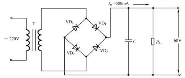由图可知,交流输入端为:220V/50HZ,要求整流输出的直流电压为UO=60V,负载电流为IO=500mA;下面是两种计算方式:
