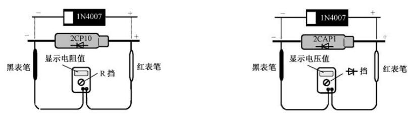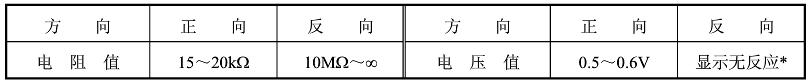 注:在反向接法进行“二极管”档测试时,虽然二极管反向漏电极小,但由于反向电阻很大,根据欧姆定律U=IR,使得二极管两端的反向电压仍比较大,一般为3V左右,但为什么“显示无反应”呢?