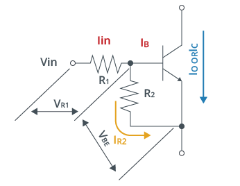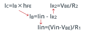 IO=IC , Iin=IB +IR2, IB=IC/hFE , IR2=VBE/R2