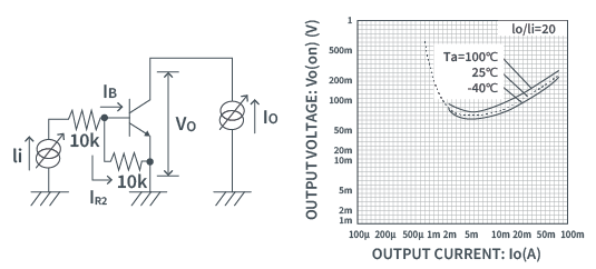 IB=Ii-IR2=Ii-65μA 即Ii在65µA以下时,IB没有电流流过,VO [VCE(sat)]上升。 因此,在低电流区域不能测定VO。