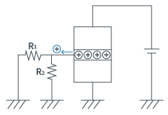 如果在基极(B)领域注入+电子,发射极(E)的载流子-会被吸引至基极(B),但是正极(B)领域非常薄,因此通过加入集电极电压,载流子可以穿越基极(B)流向集电极(C)。